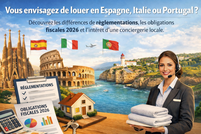 Vous envisagez de louer en Espagne, Italie ou Portugal ? Découvrez les différences de réglementations, les obligations fiscales 2026 et l’intérêt d’une conciergerie locale.